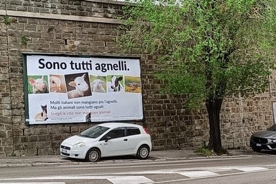 Affissione manifesti per sensibilizzare le persone a non nutrirsi di agnelli e animali durante la Pasqua. Contribuisci anche tu con la raccolta fondi su BuonaCausa.org. Qui dettagli.