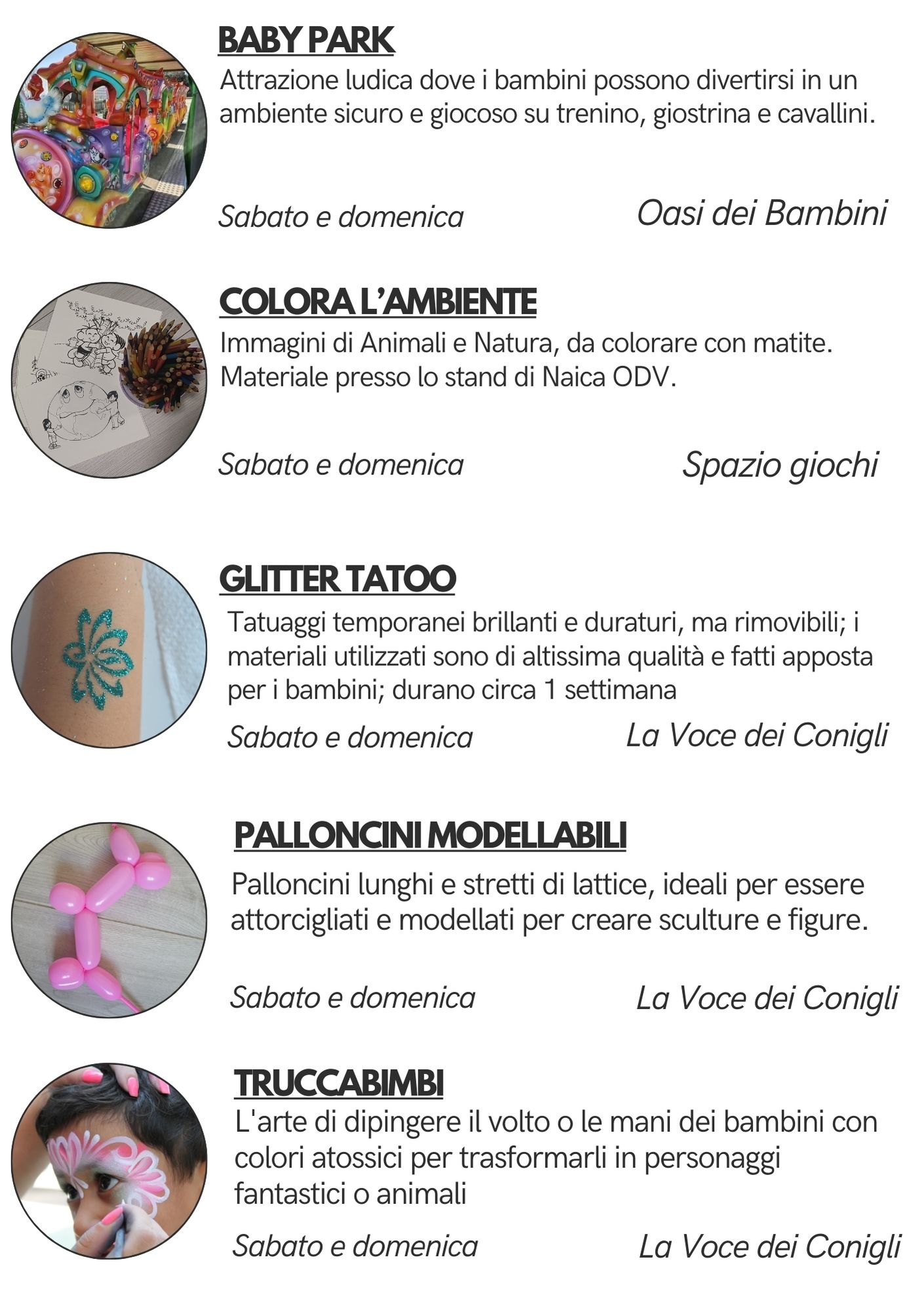 - Presso lo stand "LA VOCE DEI CONIGLI", glitter tatoo, palloncini modellabili e truccabimbi.