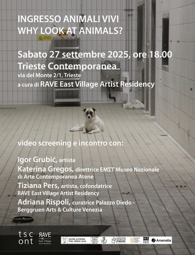 Interviene Tiziana Pers, artista e co-fondatrice "RAVE East Village Artist Residency", un metaprogetto partecipativo ideato dalle artiste Isabella e Tiziana Pers, che dal 2011 apre il dialogo sul ruolo dell'arte contemporanea nei confronti dell'alterità animale e sulla necessità di ripensarsi in una prospettiva biocentrica e antispecista. "RAVE" è anche un rifugio perché prende vita in un borgo friulano dove vivono animali salvati dal macello mediante la sua pratica performativa 'Art_History' e alberi sottratti all’abbattimento. Tiziana proseguirà raccontandoci di altre sue opere, attualmente esposte ad Atene nella più ampia e significativa mostra mai realizzata sull’antispecismo e i diritti animali, presso l’EMΣT Museo Nazionale di Arte Contemporanea a cura di Katerina Gregos, fino a febbraio 2025.